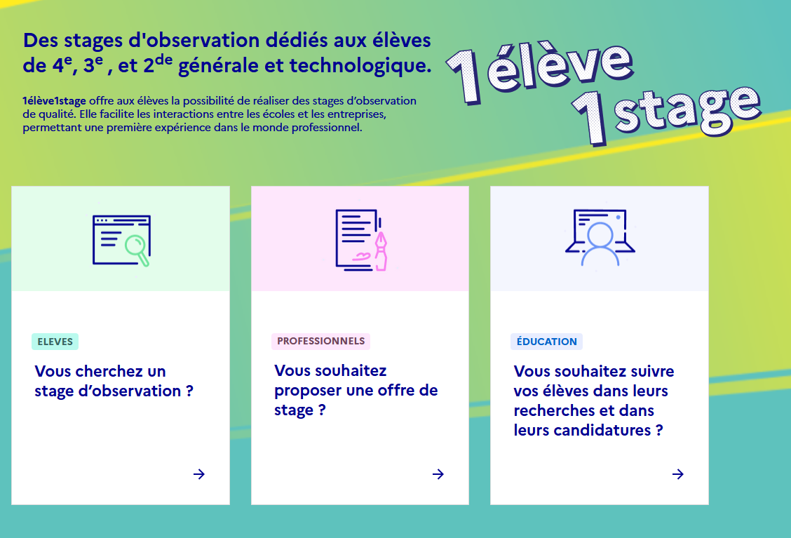 1élève1stage offre aux élèves la possibilité de réaliser des stages d’observation de qualité. Elle facilite les interactions entre les écoles et les entreprises, permettant une première expérience dans le monde professionnel.