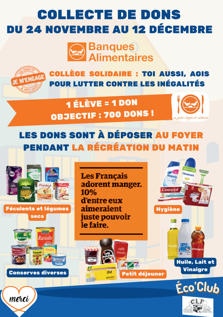 Les élèves de l'Éco'Club se mobilisent pour organiser au collège une collecte solidaire du 24 novembre au 12 décembre 2025.