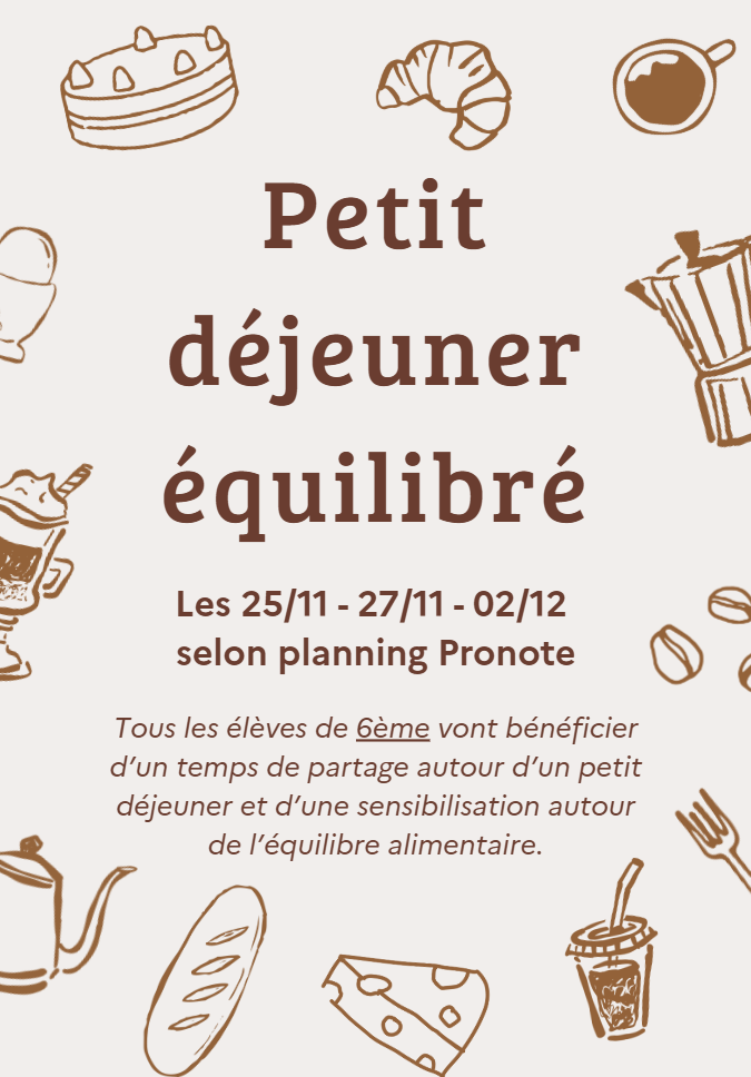 Entre les 25 novembre et 02 décembre 2025, les élèves du niveau 6ème seront invitées à partager un petit déjeuner équilibré et à une séance de sensibilisation autour de l'équilibre alimentaire, en partenariat avec les équipes de la ville de Longjumeau.