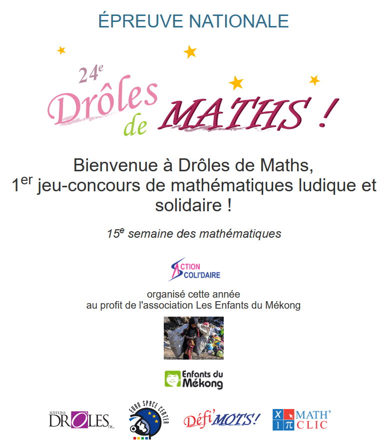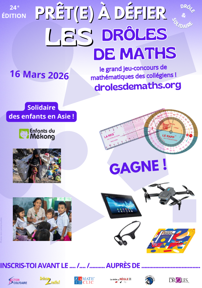 Le concours Drôle de Maths revient au Collège Pasteur pour sa 24ème édition ! Il aura lieu en mars 2026. Les inscriptions sont ouvertes jusqu'au 5 décembre 2025.