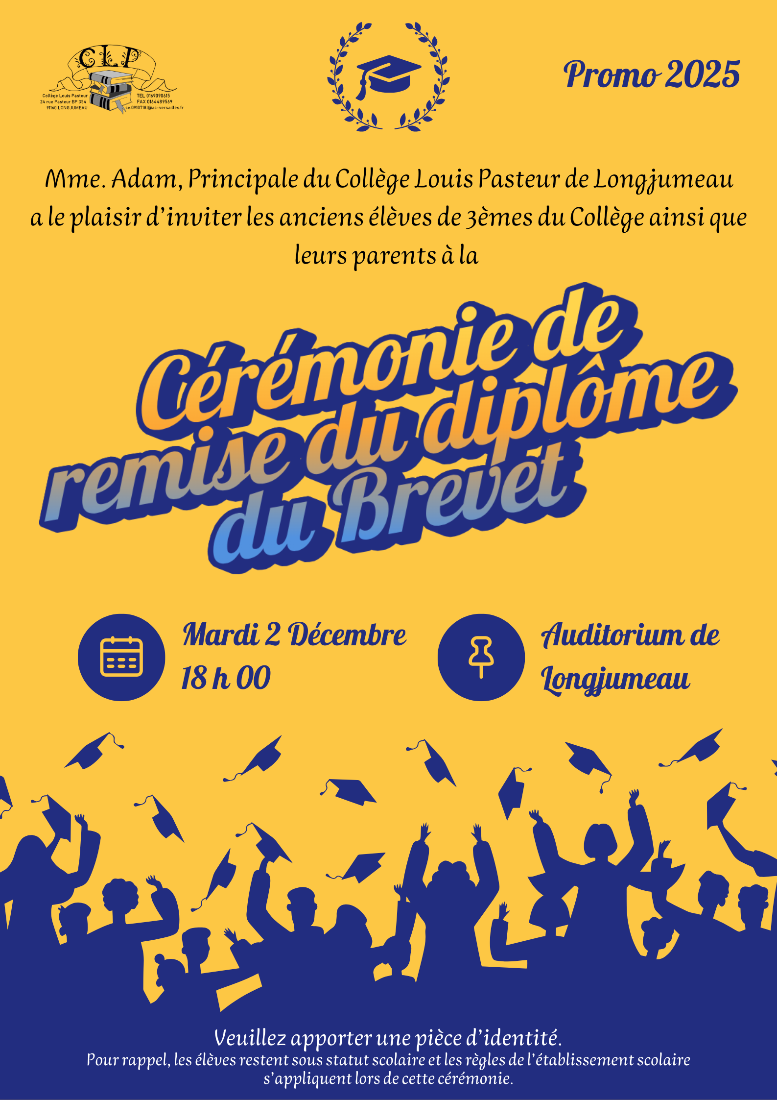 La cérémonie de remise des diplômes du Brevet pour les élèves de 3èmes de l'année scolaire 2024/2025 aura lieu le mardi 2 décembre à 18h00.
