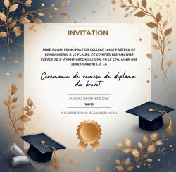 La cérémonie de remise des diplômes du Brevet pour les élèves de 3èmes de l'année scolaire 2024/2025 aura lieu le mardi 2 décembre 2025 à 18h15.
