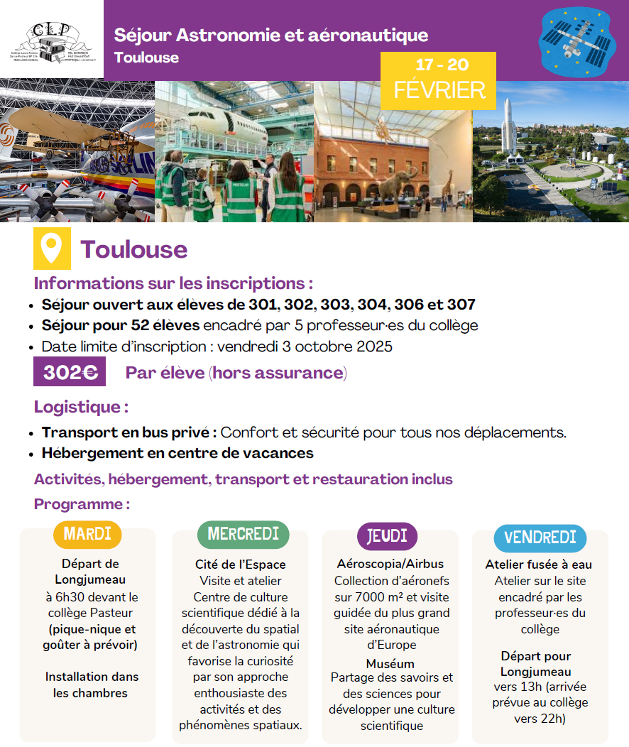 Les enseignants de Sciences et Technologie proposent aux élèves de 3ème un voyage à Toulouse sur le thème de l'aéronautique, qui aura lieu du 17 au 20 février 2026.
