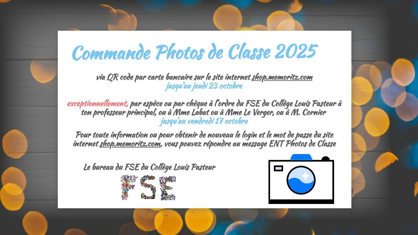 Les photos de classes et les photographies individuelles peuvent être commandées jusqu’au jeudi 23 octobre 2025.
