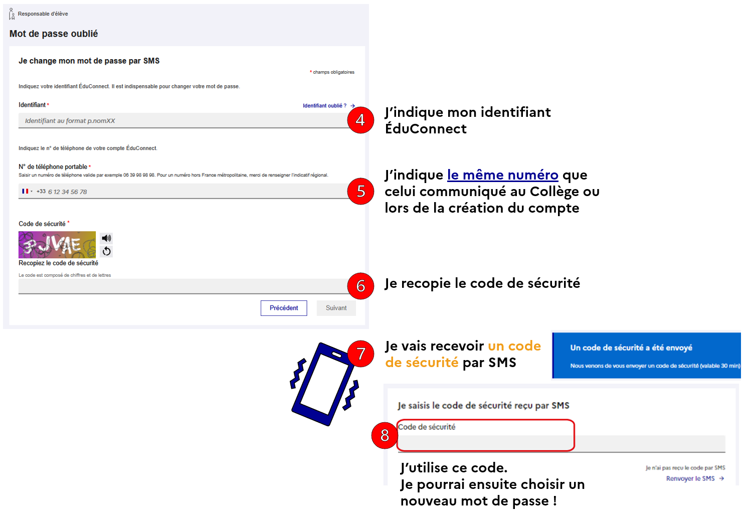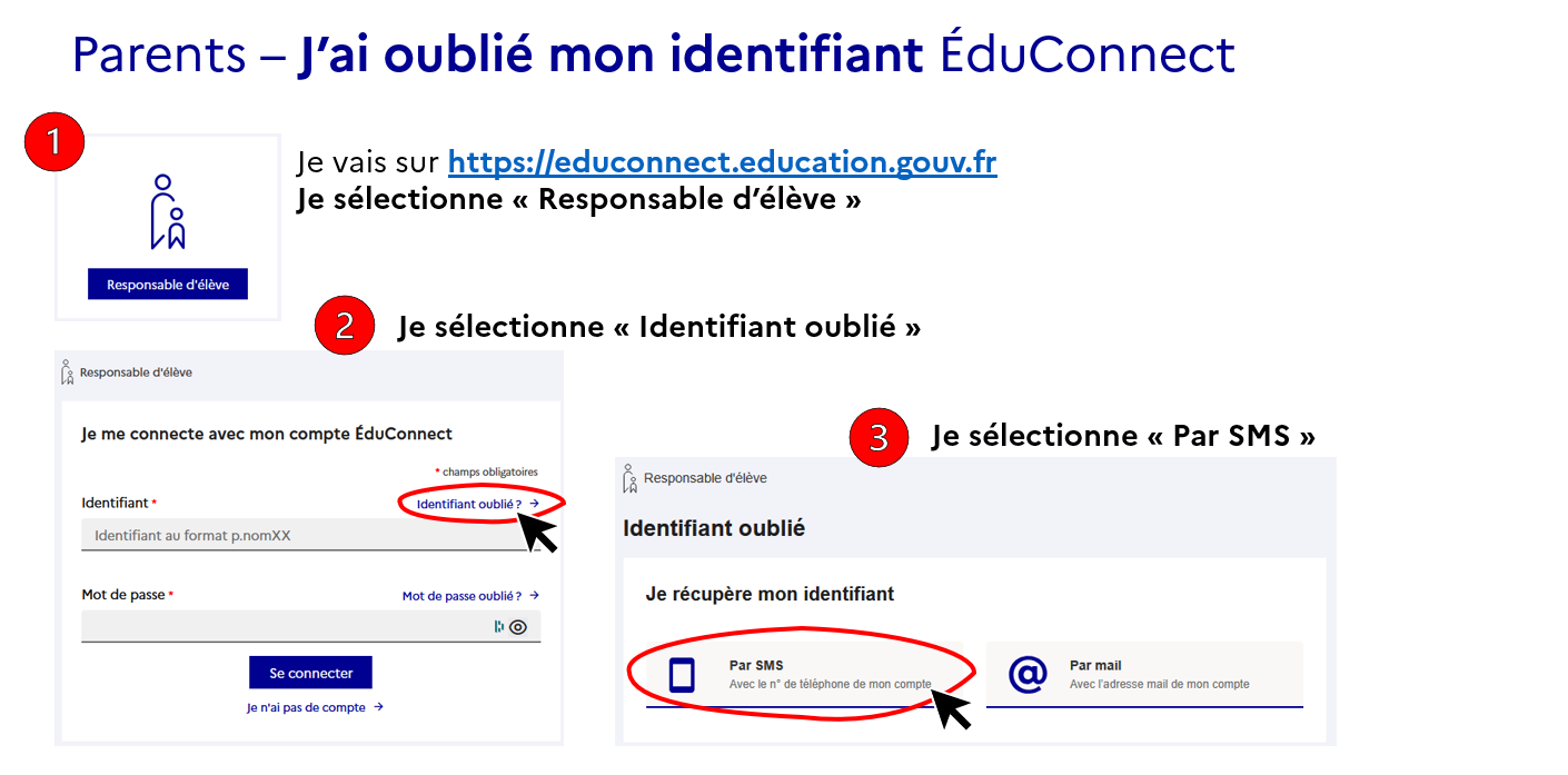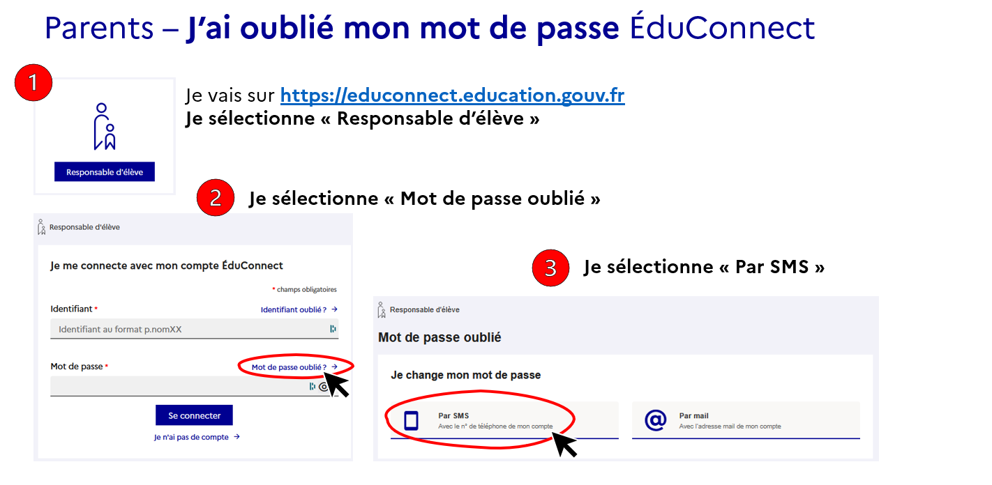 Les procédures ci dessous sont destinées aux parents et responsables d’élèves en cas de perte ou d’oubli de l’identifiant ou du mot de passe ÉduConnect.