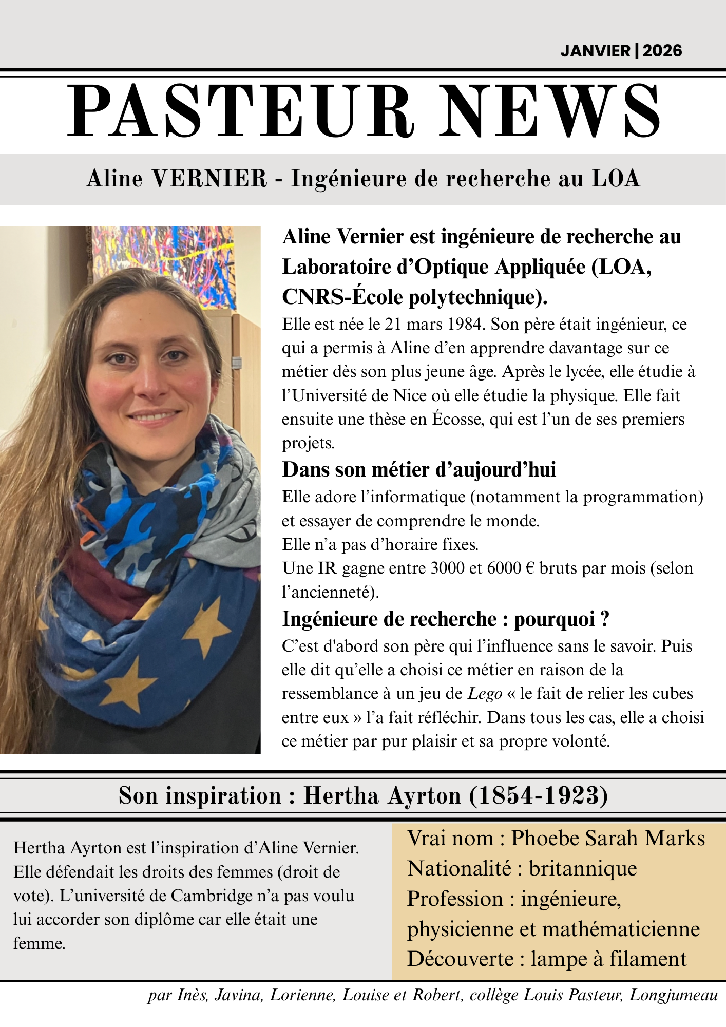 Portait-article d’Aline Vernier (LOA) réalisé par Inès, Javina, Lorienne, Louise et Robert, 303 :